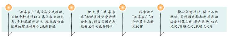《指导意见》明确,“共享农庄”建设与全域旅游、百镇千村建设以及休闲农业示范点、乡村旅游示范点、现代农业示范基地建设相结合,统筹推进。把发展“共享农庄”和脱贫攻坚紧密结合起来,优先在自然环境良好的贫困村特别是少数民族贫困村发展“共享农庄”,形成贫困户与经营主体利益共同体,通过土地入股、出租、在农庄务工等方式增加贫困户收入。探索运用“共享农庄”理念开展生态移民扶贫。精心创意设计,提升品位格调,多种形式挖掘利用展示海南村落文化、特色民居、红色文化、黎苗文化、农耕文化等。